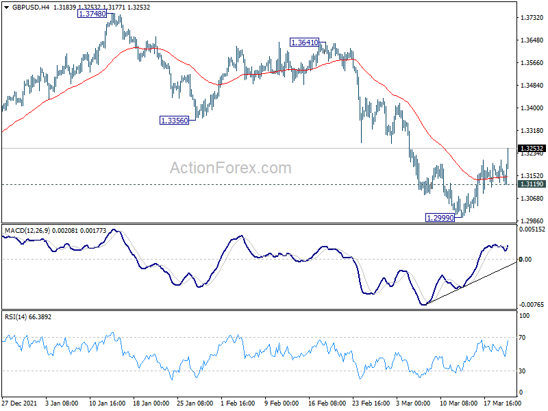GBP/USD’s break of 1.3210 minor resistance confirms short term bottoming at 1.2999. Intraday bias is back on the upside for rebound to 55 day EMA (now at 1.3361). On the downside, break of 1.3119 minor support will turn intraday bias back to the downside for retesting 1.2999. Firm break there will resume larger down trend from 1.4248.