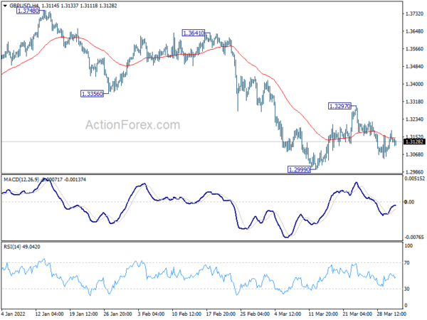 Intraday bias in GBP?USD remains neutral as consolidation from 1.2999 is extending. Outlook remains bearish with 1.3297 resistance intact, and further decline is expected. On the downside, break of 1.2999 low will resume larger down trend from 1.4248. However, firm break of 1.3297 will turn bias back to the upside for stronger rebound.