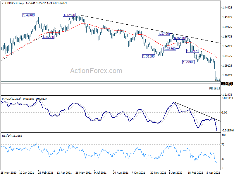 In the bigger picture, rise from 1.1409 (2020 low) has completed at 1.4248, ahead of 1.4376 long term resistance (2018 high). Based on current momentum, fall from 1.4248 is probably the start of a long term down trend. The break of 61.8% retracement of 2.1161 to 1.1409 at 1.2493 is affirming this bearish case too. For now, deeper decline would be seen as long as 1.3158 support turned resistance holds. Next target is 1.1409 low.