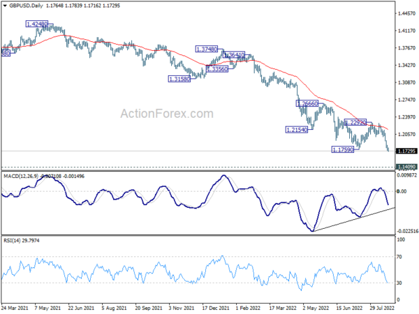 GBP/USD’s break of 1.1759 support confirms resumption of larger down trend. Intraday bias stays on the downside. Next target is 1.1409 long term support. On the upside, above 1.1835 minor resistance will turn intraday bias neutral and bring consolidations. But recovery should be limited well below 1.2292 resistance to bring another decline.