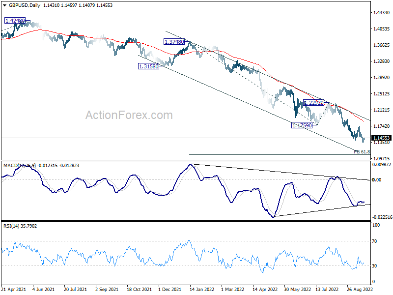 In the bigger picture, based on current momentum, fall from 1.4248 (2018 high) is probably resuming long term down trend from 2.1161 (2007 high). Sustained break of 1.1409 will target 61.8% projection of 1.7190 (2014 high) to 1.1409 (2020 low) from 1.4248 (2021 high) at 1.0675. This will remain the favored case for now as long as 1.2292 resistance holds.