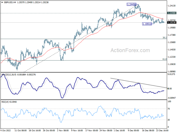 Intraday bias in GBP/USD stays neutral at this point. On the downside, break of 1.1991 will resume the fall from 1.2445 to 55 day EMA (now at 1.1916). Firm break there will target 38.2% retracement of 1.0351 to 1.2445 at 1.1645. On the upside, break of 1.2240 minor resistance will turn bias back to the upside for retesting 1.2445 instead.