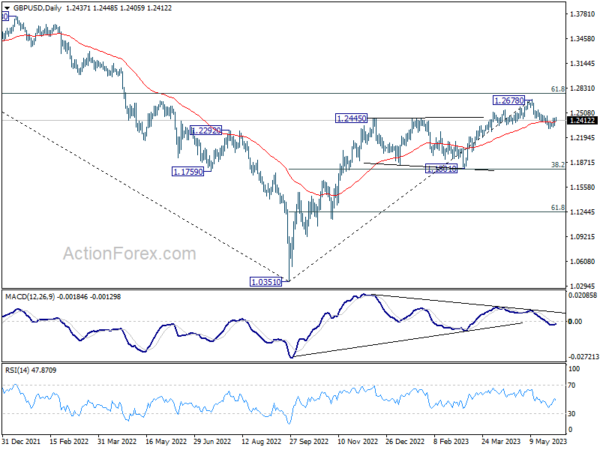 Intraday bias in GBP/USD stays neutral at this point and further decline is expected with 1.2468 minor resistance intact. On the downside, break of 1.2306 will resume the fall from 1.2678, as correcting whole up trend from 1.0351, to 1.1801 cluster support (38.2% retracement of 1.0351 to 1.2678 at 1.1789). On the upside, however, firm break of 1.2468 will turn bias back to the upside for stronger rebound.