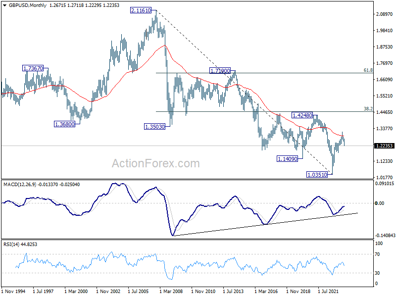 In the bigger picture, fall from 1.3141 medium term top is seen as a correction to up trend from 1.0351 (2022 low). Deeper decline would be seen to 38.2% retracement of 1.0351 to 1.3141 at 1.2075. Strong support would be seen there to bring rebound on first attempt. However, sustained break of 1.2075 will raise the chance of bearish trend reversal and target 1.1801 structural support next.