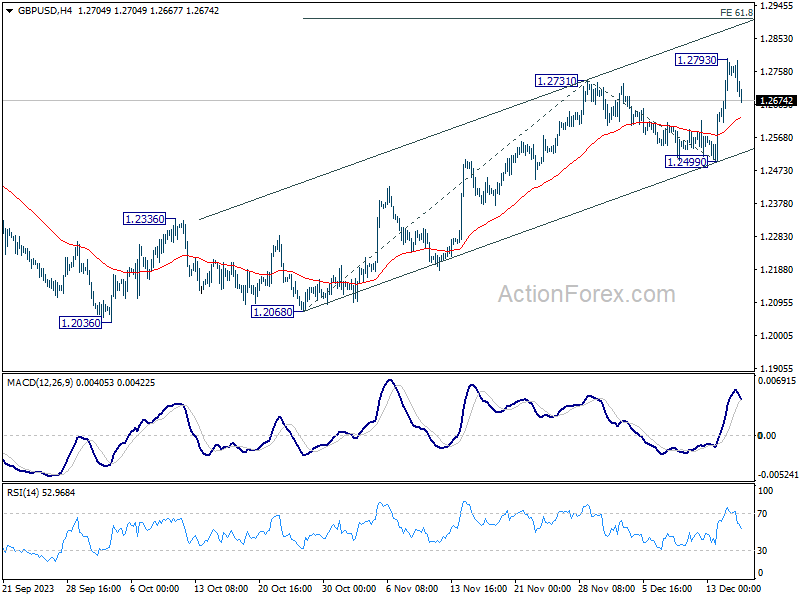 GBP/USD’s rise from 1.2036 resumed last week and edged higher to 1.2793. But with subsequent retreat, initial bias stays neutral this week for consolidations first. Outlook will stay bullish as long as 1.2499 support holds. On the upside, break of 1.2793 will resume the rally to 61.8% projection of 1.2068 to 1.2731 from 1.2499 at 1.2909.