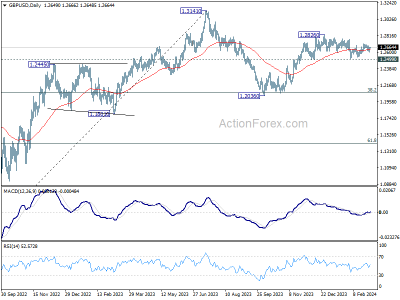 In the bigger picture, price actions from 1.3141 medium term top are seen as a corrective pattern to up trend from 1.0351 (2022 low). Rise from 1.2036 is seen as the second leg, which could be still in progress. But upside should be limited by 1.3141 to bring the third leg of the pattern. Meanwhile, break of 1.2499 support will argue that the third leg has already started for 38.2% retracement of 1.0351 (2022 low) to 1.3141 at 1.2075 again.