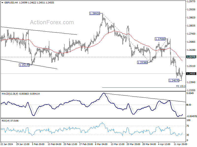 In the bigger picture, price actions from 1.3141 medium term top are seen as a corrective pattern to up trend from 1.0351 (2022 low). Fall from 1.2892 is seen as the third leg. Deeper decline would be seen to 1.2036 support and possibly below. But strong support should emerge from 61.8% retracement of 1.0351 to 1.2452 at 1.1417 to complete the correction.