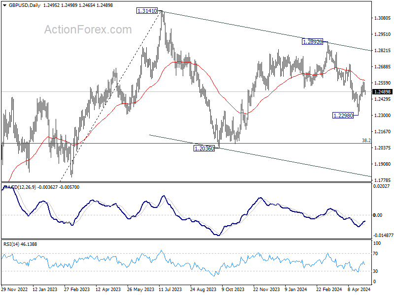In the bigger picture, price actions from 1.3141 medium term top are seen as a corrective pattern to up trend from 1.0351 (2022 low). Fall from 1.2892 is seen as the third leg. Deeper decline would be seen to 1.2036 support and possibly below. But strong support should emerge from 61.8% retracement of 1.0351 to 1.2452 at 1.1417 to complete the correction.