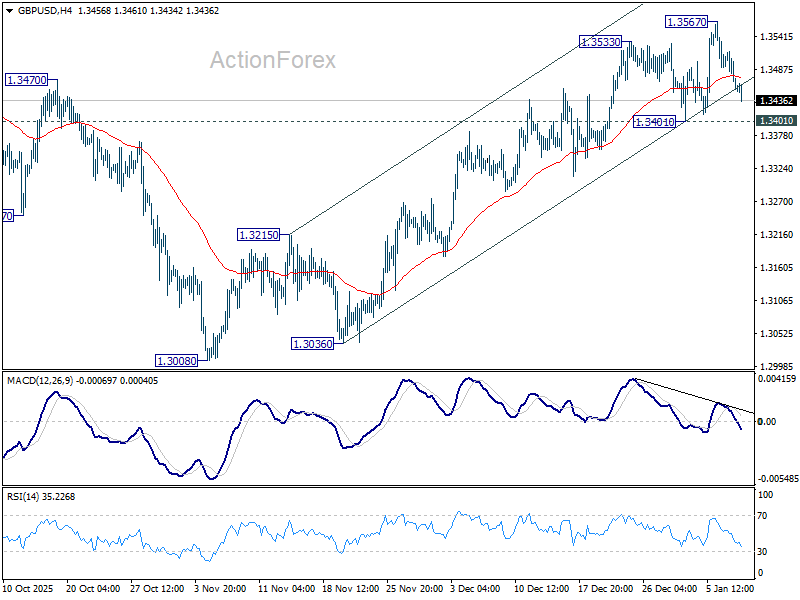 GBP/USD is still holding above 1.3401 support despite extended retreat from 1.3567. Intraday bias remains neutral and further rally is expected. On the upside, break of 1.3567 will resume the rise from 1.3008 to retest 1.3787 high. However, firm break of 1.3401 will confirm short term topping, and bring deeper fall back to 55 D EMA (now at 1.3365) and possibly below.