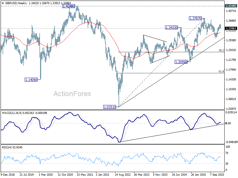 In the bigger picture, price actions from 1.3787 (2025 high) are seen as a correction to the larger up trend from 1.3051 (2022 low). Deeper decline could be seen as the pattern extends, but downside should be contained by 38.2% retracement of 1.0351 to 1.3787 at 1.2474 to bring rebound. Break of 1.3787 for up trend resumption is expected at a later stage.