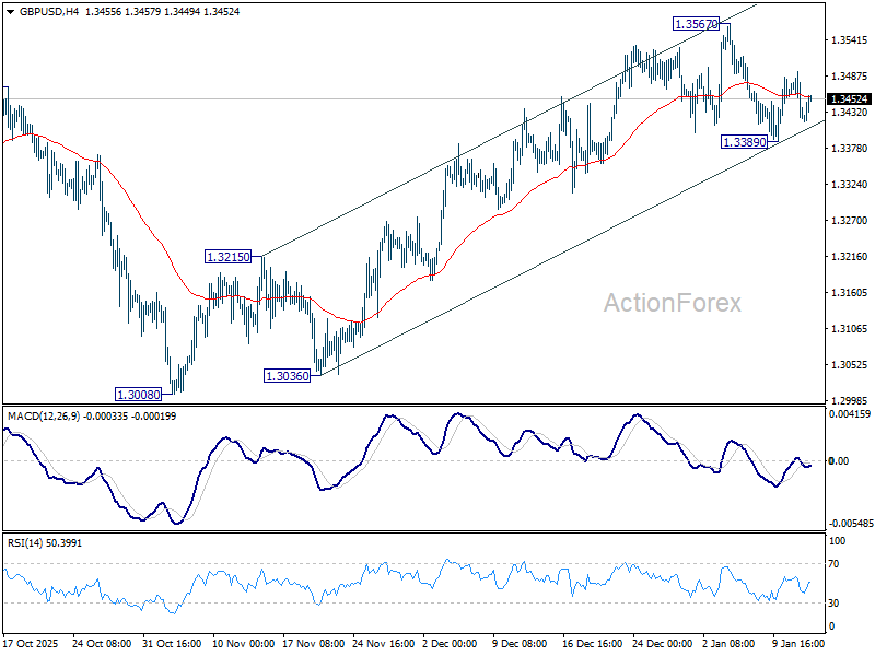 Intraday bias in GBP/USD remains neutral as range trading continues inside 1.3389/3567. On the upside, break of 1.3567 will resume the rally from 1.3008 towards 1.3787 high. On the downside, break of 1.3389 will resume the fall from 1.3567. Sustained break of 55 D EMA (now at 1.3375) will argue that the decline is another falling leg in the corrective pattern from 1.3787. In this case, deeper fall should be seen back to 1.3008 support.