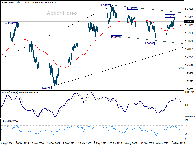 In the bigger picture, price actions from 1.3787 (2025 high) are seen as a correction to the larger up trend from 1.3051 (2022 low). Deeper decline could be seen as the pattern extends, but downside should be contained by 38.2% retracement of 1.0351 to 1.3787 at 1.2474 to bring rebound. Break of 1.3787 for up trend resumption is expected at a later stage.