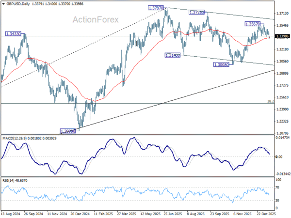 In the bigger picture, price actions from 1.3787 (2025 high) are seen as a correction to the larger up trend from 1.3051 (2022 low). Deeper decline could be seen as the pattern extends, but downside should be contained by 38.2% retracement of 1.0351 to 1.3787 at 1.2474 to bring rebound. Break of 1.3787 for up trend resumption is expected at a later stage.