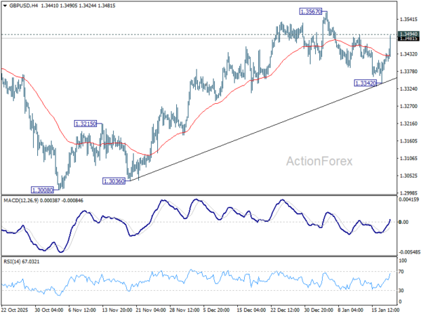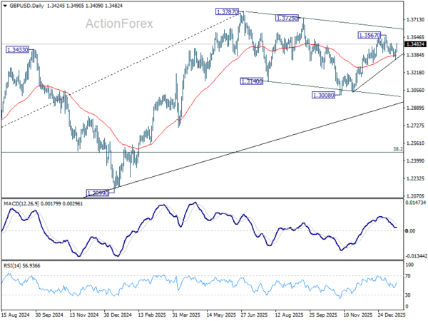 Immediate focus is now on 1.3494 resistance as GBP/USD’s rebound from 1.3342 extends higher. Firm break there will suggest that pullback from 1.3567 has completed after drawing support from 55 D EMA (now at 1.3375). Intraday bias will be back on the upside for 1.3567 first. Break there will resume the rally from 1.3008 to retest 1.3787 high. On the downside, sustained trading below 55 D EMA will argue that the decline is another falling leg in the corrective pattern from 1.3787.