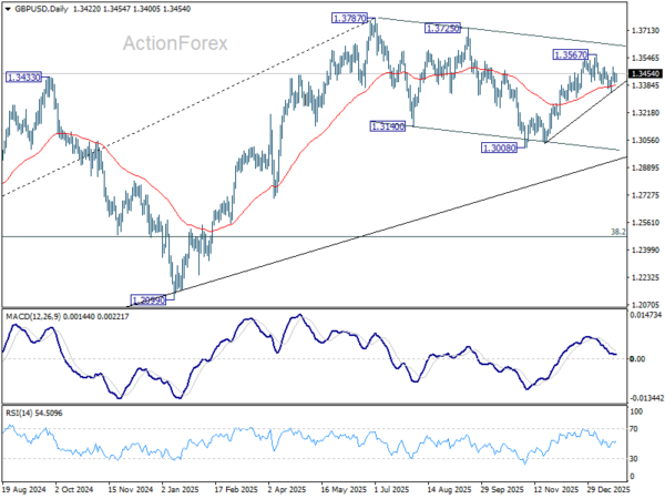 No change in GBP/USD’s outlook as range trading still continues. Intraday bias stays neutral for the moment. On the upside, firm break of 1.3494 will suggest that pullback from 1.3567 has completed at 1.3342, after drawing support from 55 D EMA (now at 1.3382). Intraday bias will be back on the upside for 1.3567 first. Break there will resume the rally from 1.3008 to retest 1.3787 high. On the downside, sustained trading below 55 D EMA will argue that the decline is another falling leg in the corrective pattern from 1.3787.