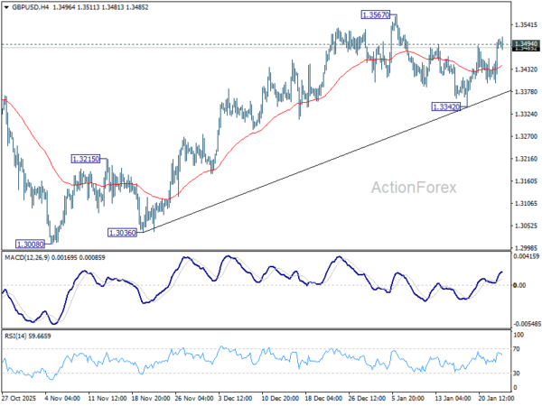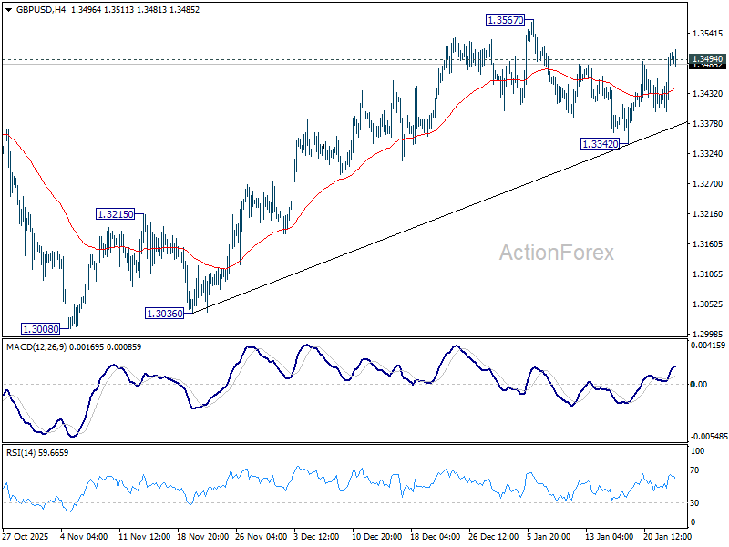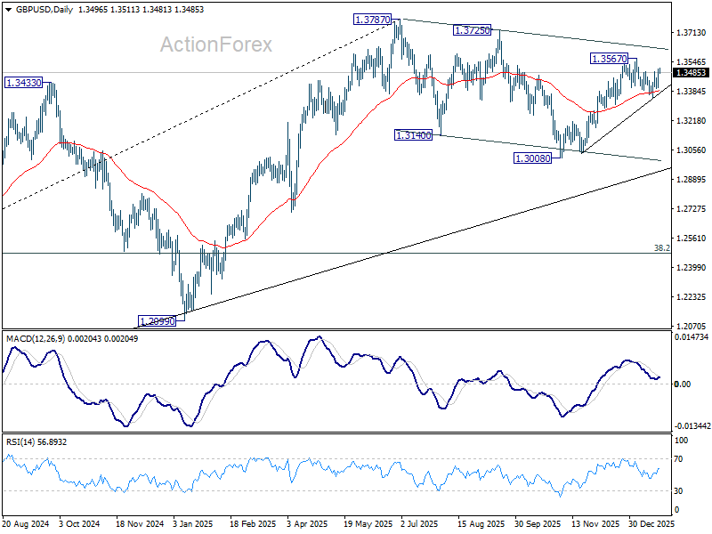 Breach of 1.3494 resistance suggests that GBP/USD’s pullback from 1.3567 has completed at 1.3342. Intraday bias is back on the upside for 1.3567. Firm break there will resume the rally from 1.3008 to retest 1.3787 high. However, break of 1.3342 will resume the fall from 1.3567 towards 1.3008.