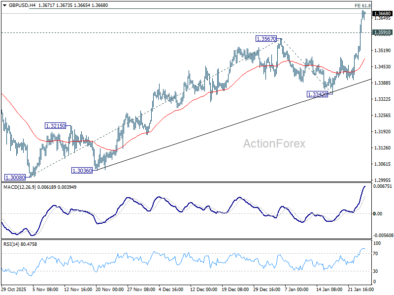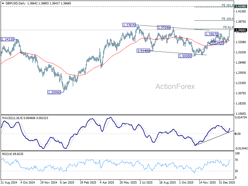 GBP/USD’s rally continues today and intraday bias stays on the upside at this point. Firm break of 61.8% projection of 1.3008 to 1.3567 from 1.3342 at 1.3687 should prompt upside acceleration through 1.3787 high to 100% projection at 1.3901. On the downside, below 1.3591 minor support will turn intraday bias neutral. But retreat should be contained well above 1.3342 support to bring another rally.
