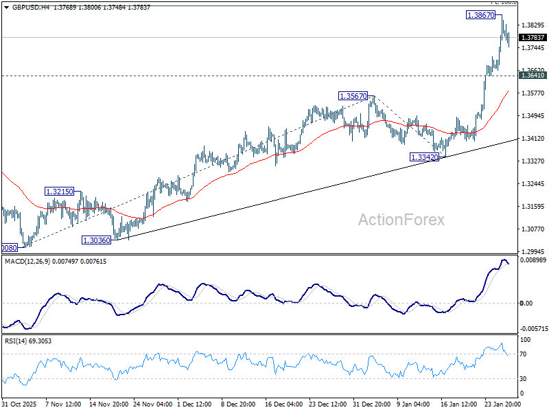 A temporary top was formed at 1.3867 with current retreat, and intraday bias is turned neutral in GBP/USD first. Downside of consolidations should be contained by 1.3641 to bring another rally. Firm break of 100% projection of 1.3008 to 1.3567 from 1.3342 at 1.3901 will pave the way to 161.8% projection at 1.4246, which is close to 1.4248 key structural resistance. However, break of 1.3641 will turn bias to the downside for deeper pullback.