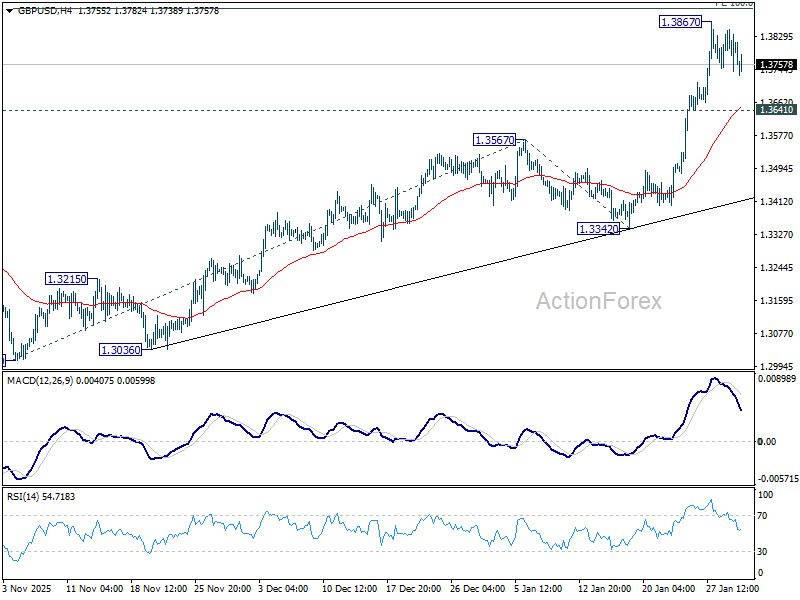 Intraday bias in GBP/USD remains neutral as consolidations continue below 1.3867 temporary top. Downside should be contained by 1.3641 to bring another rally. Firm break of 100% projection of 1.3008 to 1.3567 from 1.3342 at 1.3901 will pave the way to 161.8% projection at 1.4246, which is close to 1.4248 key structural resistance. However, break of 1.3641 will turn bias to the downside for deeper pullback.