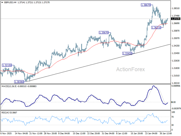 Intraday bias in GBP/USD is turned neutral first with current recovery. Below 1.3621 will extend the pullback from 1.3867 short term top to 55 D EMA (now at 1.3471). On the upside, firm break of 1.3867 will resume larger up trend towards 1.4284 key resistance.