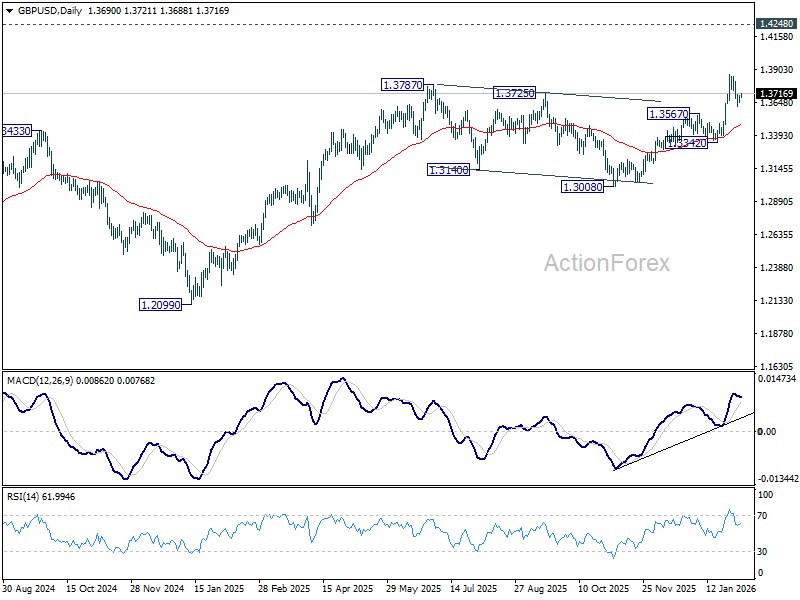 In the bigger picture, rise from 1.0351 (2022 low) is resuming by breaking through 1.3787 high. Further rally should be seen to 1.4284 key resistance (2021 high). Decisive break there will add to the case of long term bullish trend reversal. For now, outlook will stay bullish as long as 1.3008 support holds, even in case of deep pullback.