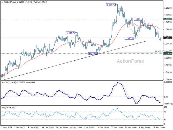 Intraday bias in GBP/USD remains mildly on the downside as this point. Fall from 1.3867 is extending. Sustained trading below 55 D EMA (now at 1.3518) will raise the chance of larger scale correction. Deeper fall should then be seen to 1.3342 support for confirmation. On the upside, break of 1.3711 will bring retest of 1.3867 high.