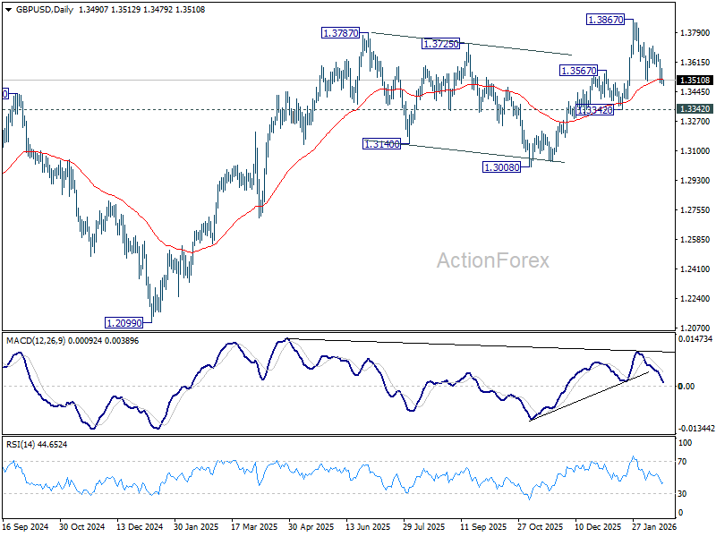 Intraday bias in GBP/USD remains mildly on the downside as this point. Fall from 1.3867 is extending. Sustained trading below 55 D EMA (now at 1.3518) will raise the chance of larger scale correction. Deeper fall should then be seen to 1.3342 support for confirmation. On the upside, break of 1.3711 will bring retest of 1.3867 high.