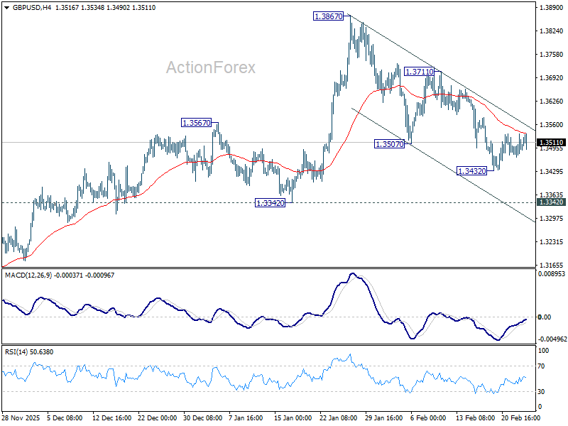 Range trading continues in GBP/USD and intraday bias remains neutral. On the downside, below 1.3432 will resume the fall from 1.3867 to 1.3342 support. Firm break there should confirm that it’s already correcting the whole rise from 1.2099. However, break of 1.3711 resistance will argue that the decline has completed as a near term correction, and turn bias back to the upside for retesting 1.3867.