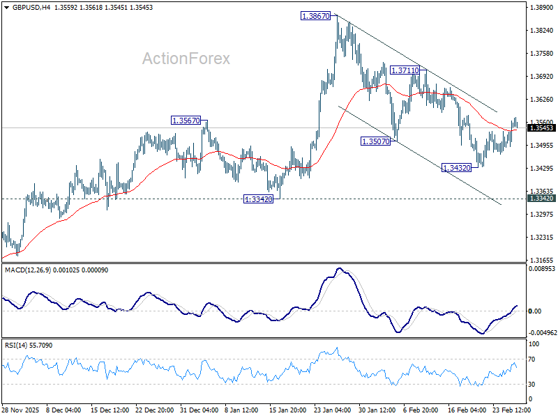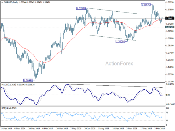 Intraday bias in GBP/USD remains neutral for the moment. On the downside, below 1.3432 will resume the fall from 1.3867 to 1.3342 support. Firm break there should confirm that it’s already correcting the whole rise from 1.2099. However, break of 1.3711 resistance will argue that the decline has completed as a near term correction, and turn bias back to the upside for retesting 1.3867.