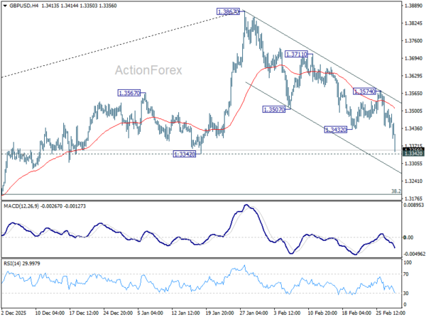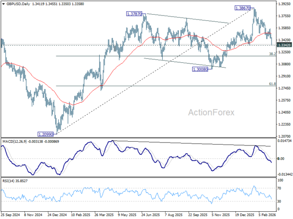 GBP/USD’s decline from 1.3867 resumed by breaking through 1.3432 today, and intraday bias is back on the downside. Firm break of 1.3342 support should confirm that confirm that it’s already correcting the whole rise from 1.2099. In this case, deeper fall should be seen to 1.3008 support next. For now, risk will stay on the downside as long as 1.3574 resistance holds, in case of recovery.