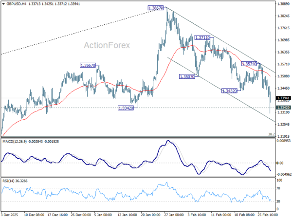 Intraday bias in GBP/USD remains on the downside with focus on 1.3342 structural support. Decisive break there should confirm that fall from 1.3867 is already correcting the whole rise from 1.2099. In this case, deeper fall should be seen to 1.3008 support next. For now, risk will stay on the downside as long as 1.3574 resistance holds, in case of recovery.