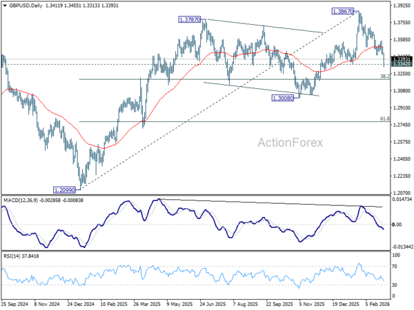 In the bigger picture, as long as 1.3008 support holds, rise from 1.3051 (2022 low) should still be in progress for 1.4284 key resistance (2021 high). Decisive break there will add to the case of long term bullish trend reversal. However, firm break of 1.3008 will raise the chance of medium term bearish reversal and target 1.2099 support next.
