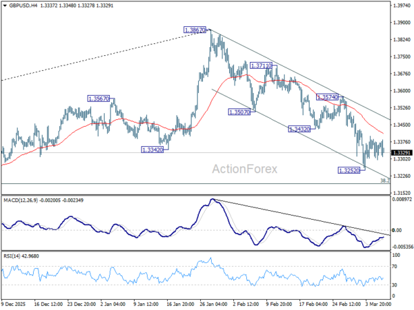 GBP/USD is still bounded in consolidations in tight range above 1.3252 and intraday bias remains neutral. Fall from 1.3867 should at least be correcting the rise from 1.2009. Below 1.3252 will target 38.2% retracement of 1.2099 to 1.3867 at 1.3192. Sustained break there will pave the way to 1.3008 support. For now, risk will stay on the downside as long as 1.3574 resistance holds, in case of recovery.