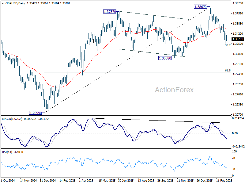 In the bigger picture, as long as 1.3008 support holds, rise from 1.3051 (2022 low) should still be in progress for 1.4284 key resistance (2021 high). Decisive break there will add to the case of long term bullish trend reversal. However, firm break of 1.3008 will raise the chance of medium term bearish reversal and target 1.2099 support next.