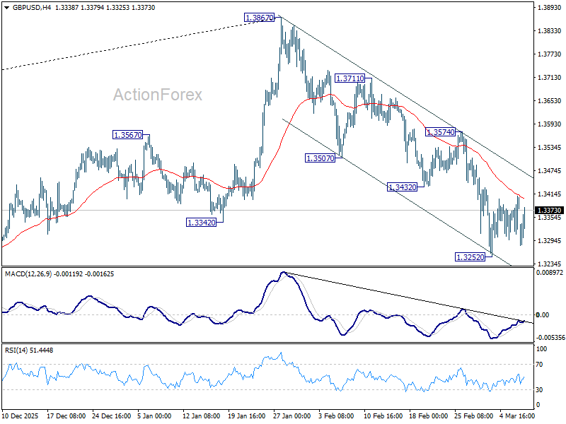 GBP/USD is still bounded in range above 1.3252 and intraday bias remains neutral. Risk will stay on the downside as long as 1.3574 resistance holds, in case of stronger rebound. On the downside, below 1.3252 will extend the fall from 1.3867 to 1.3008 structural support. Decisive break there will carry larger bearish implications.