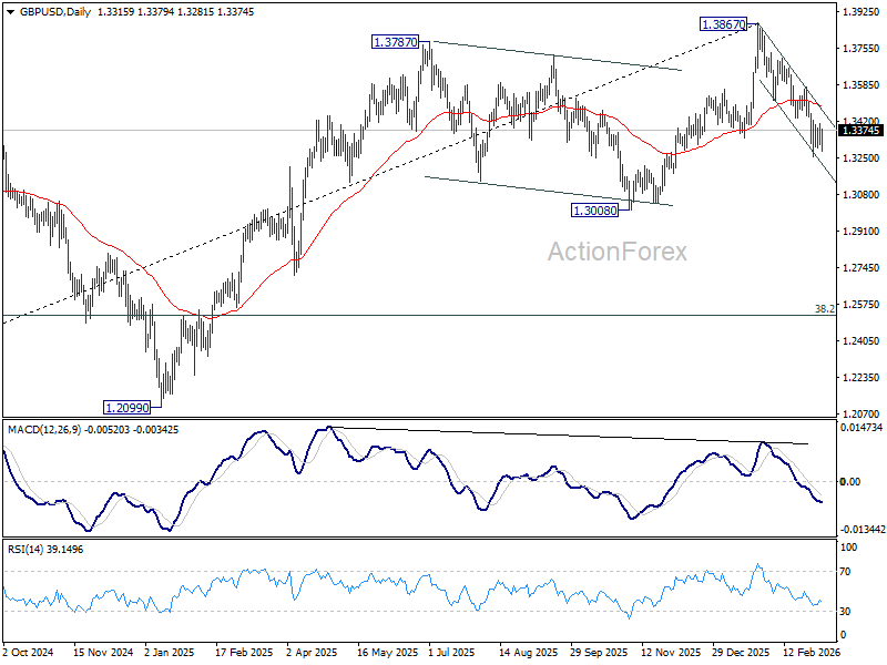 In the bigger picture, considering bearish divergence condition in both D and W MACD, a medium term top should be in place from 1.3867. Firm break of 1.3008 support will argue that fall from 1.3867 is at least corrective the whole rise from 1.0351 (2022 low) with risk of bearish reversal. That would open up further decline to 38.2% retracement of 1.0351 to 1.3867 at 1.2524. For now, medium term outlook will be neutral at best as long as 1.3867 resistance holds, or under further development.