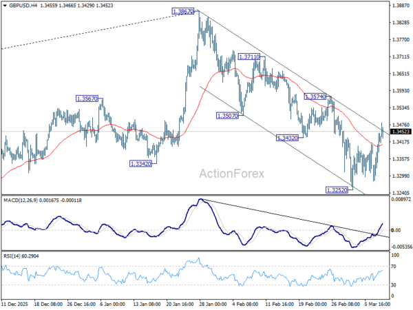 GBP/USD’s recovery from 1.3252 extended higher today but upside is still capped well below 1.3574 resistance. Intraday bias remains neutral and further fall is in favor. On the downside, below 1.3252 will extend the decline from 1.3867 to 1.3008 structural support. Decisive break there will carry larger bearish implications.