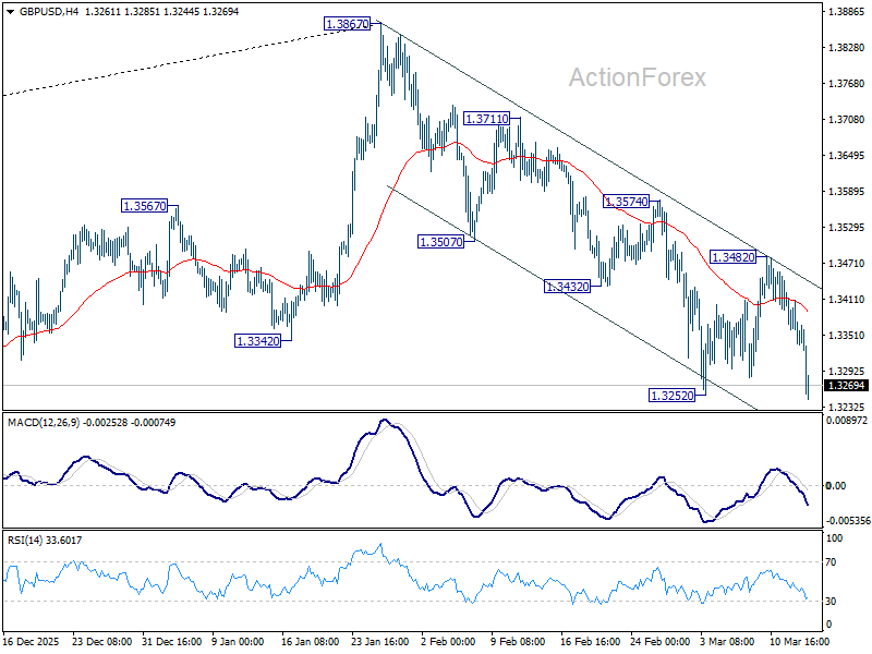 Intraday bias in GBP/USD is back on the downside with breach of 1.3252 support. Fall from 1.3867 is resuming, and should target 1.3008 structural support. For now, risk will stay on the downside as long as 1.3482 resistance holds, in case of recovery.