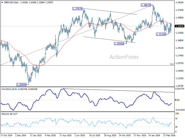 Range trading continues in GBP/USD and intraday bias remains neutral for the moment. With 1.3482 resistance intact, further decline is in favor. On the downside, below 1.3216 will resume the fall from 1.3867 to 1.3008 structural support. However, decisive break of 1.3482 will argue that the fall from 1.3867 has completed, and turn bias back to the upside for 61.8% retracement of 1.3867 to 1.3216 at 1.3618.