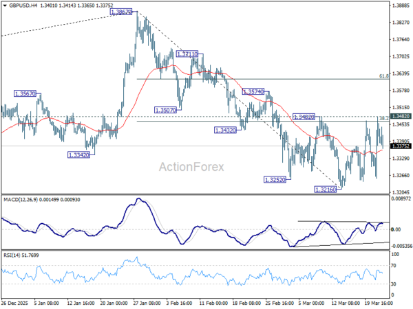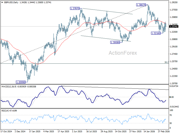 GBP/USD is still bounded in established range above 1.3216 and intraday bias remains neutral at this point. With 1.3482 resistance intact, further decline is in favor. On the downside, below 1.3216 will resume the fall from 1.3867 to 1.3008 structural support. However, decisive break of 1.3482 will argue that the fall from 1.3867 has completed, and turn bias back to the upside for 61.8% retracement of 1.3867 to 1.3216 at 1.3618.
