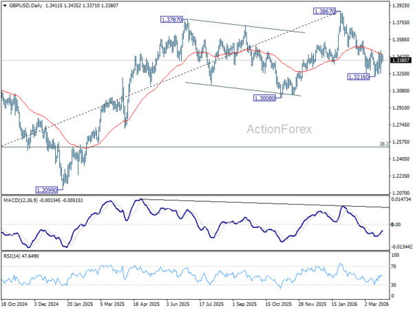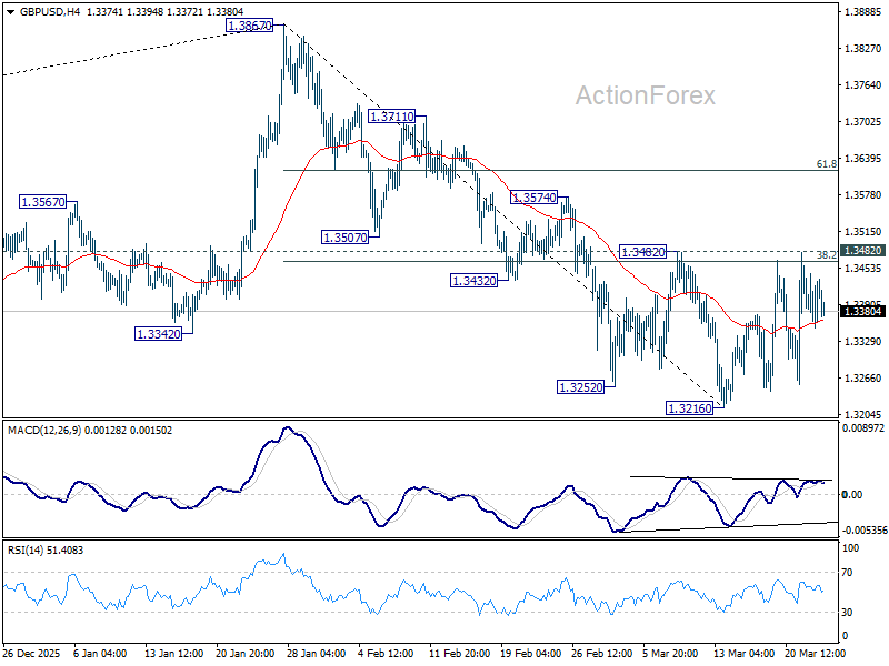 Range trading continues in GBP/USD and intraday bias stays neutral. With 1.3482 resistance intact, further decline is in favor. On the downside, below 1.3216 will resume the fall from 1.3867 to 1.3008 structural support. However, decisive break of 1.3482 will argue that the fall from 1.3867 has completed, and turn bias back to the upside for 61.8% retracement of 1.3867 to 1.3216 at 1.3618.