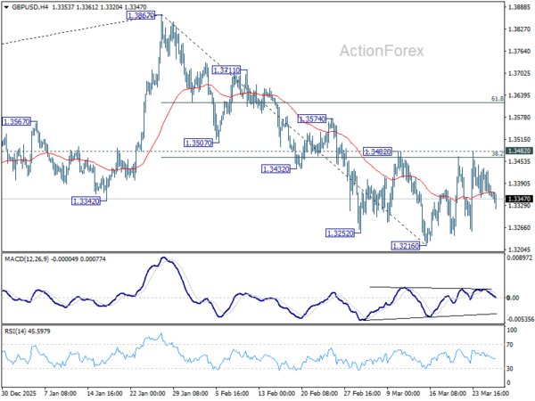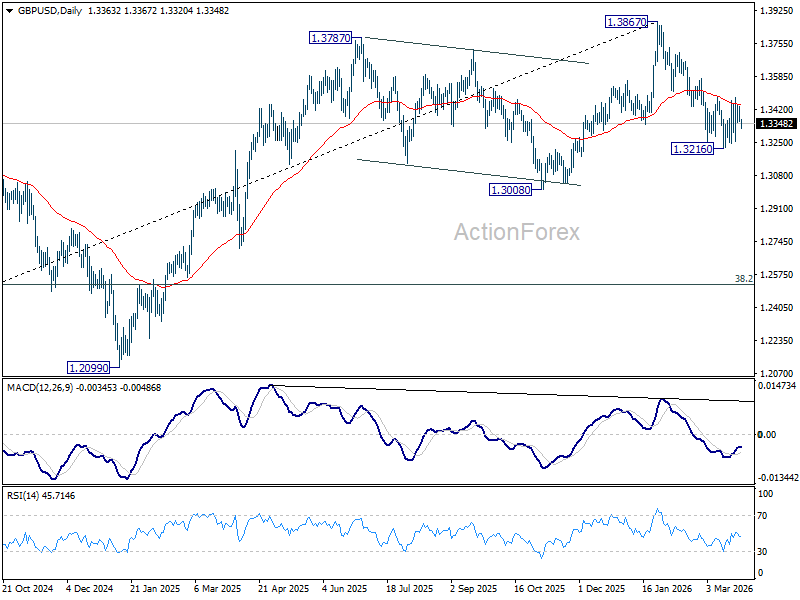 GBP/USD dips mildly today but stays in established range. Intraday bias stays neutral at this point. With 1.3482 resistance intact, further decline is in favor. On the downside, below 1.3216 will resume the fall from 1.3867 to 1.3008 structural support. However, decisive break of 1.3482 will argue that the fall from 1.3867 has completed, and turn bias back to the upside for 61.8% retracement of 1.3867 to 1.3216 at 1.3618.
