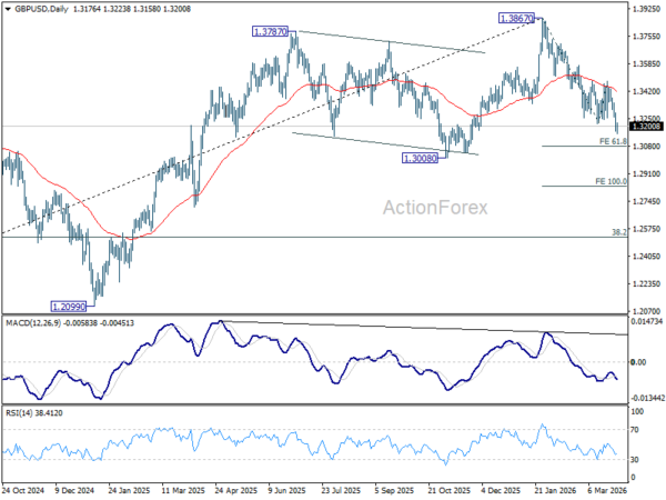GBP/USD’s fall from 1.3867 resumed by breaking through 1.3216 support. Intraday bias is back on the downside for 61.8% projection of 1.3867 to 1.3216 from 1.3479 at 1.3077 first. Decisive break there could prompt downward acceleration through 1.3008 support to 100% projection at 1.2828. On the upside, above 1.3282 minor resistance will turn intraday bias neutral. But outlook will remain bearish as long as 1.3479 resistance holds, in case of recovery.