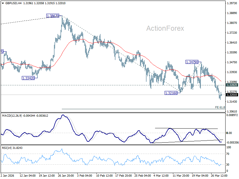 GBP/USD’s fall from 1.3867 resumed by breaking through 1.3216 support. Intraday bias is back on the downside for 61.8% projection of 1.3867 to 1.3216 from 1.3479 at 1.3077 first. Decisive break there could prompt downward acceleration through 1.3008 support to 100% projection at 1.2828. On the upside, above 1.3282 minor resistance will turn intraday bias neutral. But outlook will remain bearish as long as 1.3479 resistance holds, in case of recovery.