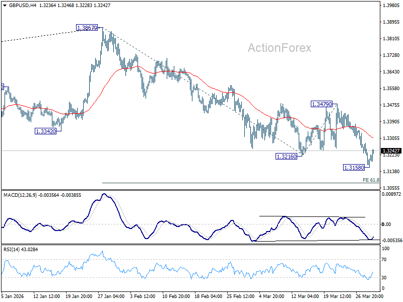 A temporary low is formed at 1.3158 with current recovery, and intraday bias in GBP/USD is turned neutral. Some consolidations could be seen, but outlook will remain bearish as long as 1.3479 resistance holds. Below 1.3158 will resume the fall from 1.3867 to 61.8% projection of 1.3867 to 1.3216 from 1.3479 at 1.3077 first. Decisive break there could prompt downward acceleration through 1.3008 support to 100% projection at 1.2828.