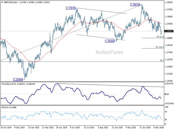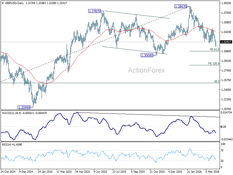 In the bigger picture, considering bearish divergence condition in both D and W MACD, a medium term top should be in place at 1.3867. Firm break of 1.3008 support will argue that fall from 1.3867 is at least correcting the rise from 1.0351 (2022 low) with risk of bearish reversal. That would open up further decline to 38.2% retracement of 1.0351 to 1.3867 at 1.2524. For now, medium term outlook will be neutral at best as long as 1.3867 resistance holds, or until further development.
