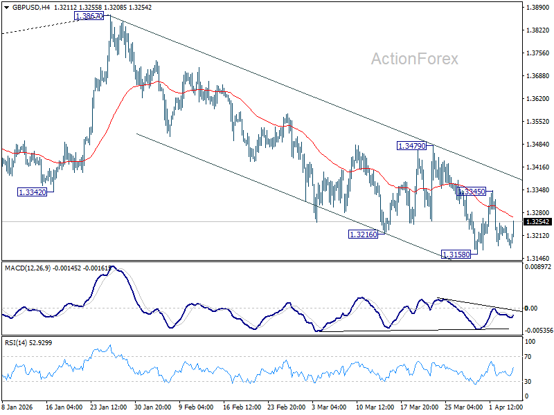 GBP/USD is extending consolidations above 1.3158 and intraday bias remains neutral at this point. With 1.3479 resistance intact, further decline is still in favor. Below 1.3158 will resume the fall from 1.3867 to 1.3008 structural support. However, firm break of 1.3479 will indicate that the fall from 1.3867 has completed, and turn bias back to the upside for stronger rally.
