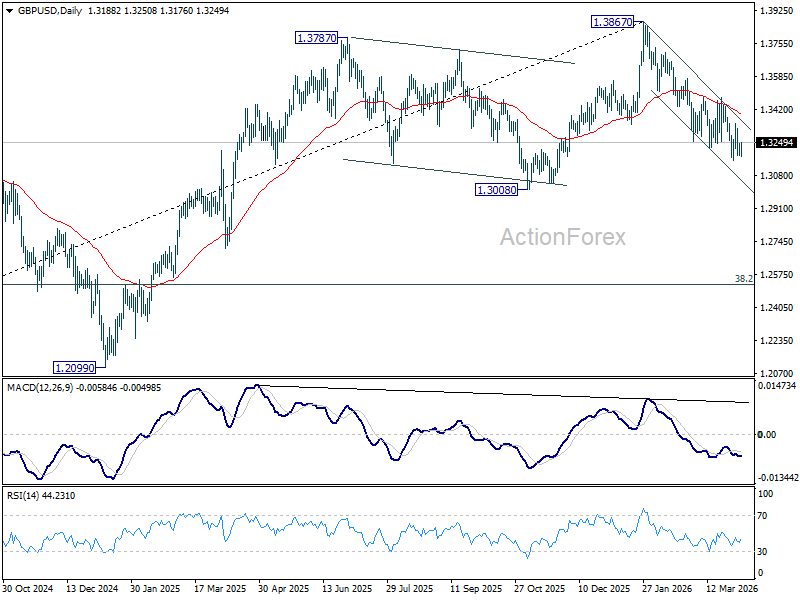 In the bigger picture, considering bearish divergence condition in both D and W MACD, a medium term top should be in place at 1.3867. Firm break of 1.3008 support will argue that fall from 1.3867 is at least correcting the rise from 1.0351 (2022 low) with risk of bearish reversal. That would open up further decline to 38.2% retracement of 1.0351 to 1.3867 at 1.2524. For now, medium term outlook will be neutral at best as long as 1.3867 resistance holds, or until further development.
