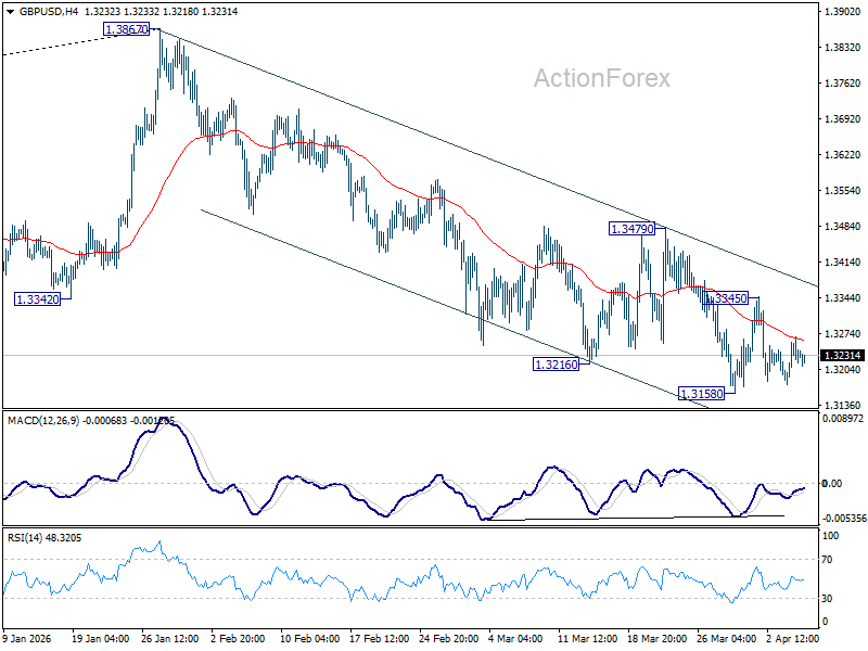 Range trading continues in GBP/USD above 1.3158 and intraday bias stays neutral. With 1.3479 resistance intact, further decline is still in favor. Below 1.3158 will resume the fall from 1.3867 to 1.3008 structural support. However, firm break of 1.3479 will indicate that the fall from 1.3867 has completed, and turn bias back to the upside for stronger rally.