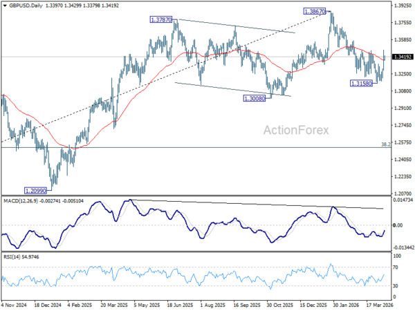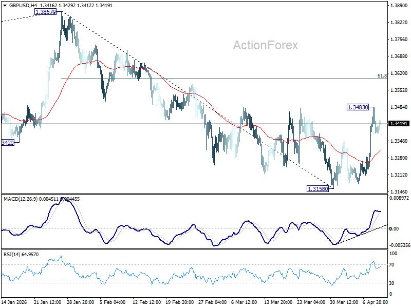 Intraday bias in GBP/USD remains neutral and some more consolidations could be seen below 1.3483 temporary top. Fall from 1.3867 could have completed as a correction at 1.3158 already. Above 1.3483 will target 61.8% retracement of 1.3867 to 1.3158 at 1.3596. Firm break there will bring retest of 1.3867 high. Nevertheless, sustained break of 55 4H EMA (now at 1.3312) will dampen this bullish view and bring retest of 1.3158 instead.